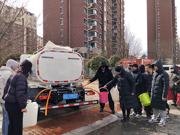 接到报告后,值班人员火速赶到现场,经初步勘查,漏点位于主干道旁,水流蔓延至路面并已结冰。为避免造成安全隐患,值班人员迅速关闭了闸门,并紧急联系维修人员和挖掘机往现场集结。同时,供水服务所立即联系受影响的墨香郡、御园、东方学府等三个小区物业,通过微信群和公司微信公众号等多渠道发布停水通知,向居民做好解释工作,公司安排刚配备的专用送水车不间断为三个小区居送自来水。