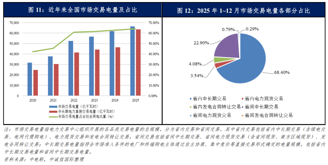 从交易情况来看,根据中电联统计,2025年1~12月,全国市场交易电量规模同比增长7.4%,占全社会用电量比重增至64.0%,同比提高1.3个百分点。从市场交易电量组成来看,2025年1~12月全国以省内中长期交易为主,占比为68.40%,其次是省间中长期交易,占比为22.90%,电力现货交易等其他交易形式占比较小,但占比呈上升趋势。2025年以来,我国中长期交易电量持续增长,发挥保供稳价的“压舱石”作用。电力现货市场建设加快推进,根据2025年4月16日国家发展改革委、国家能源局发布的《关于全面加快电力现货市场建设工作的通知》,2025年底前基本实现电力现货市场全覆盖,全面开展连续结算运行。截至2025年末,全国共有山西、广东、山东、甘肃、蒙西、湖北、浙江7个省级现货市场及省间电力现货市场转入正式运行,河北南网、安徽、江苏、吉林、黑龙江、辽宁、宁夏、陕西、重庆等14个省级现货市场及南方区域电力市场已开启连续结算试运行。未来随着“136号文”的全面落实,新能源市场化交易增量将推升我国市场化交易电量规模及占比,同时随着电力现货市场的加速建设以及两网壁垒的打通,未来电力现货执行区域以及跨电网经营区的交易电量将有所增加,我国电力市场的交易活跃度及有效性将大幅提升。