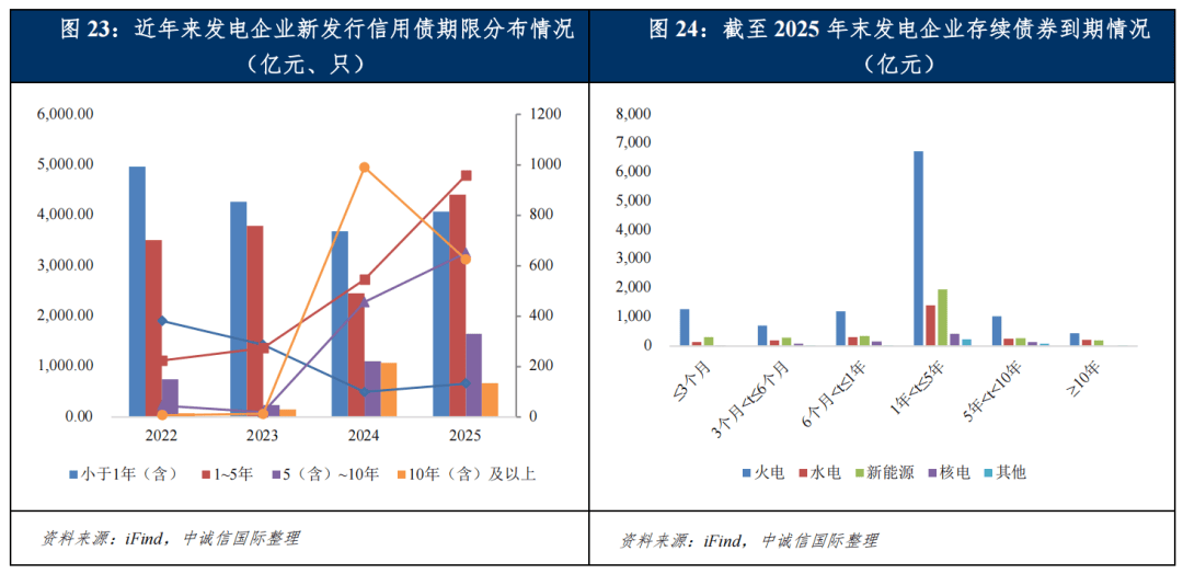 集中到期方面,2025年末发电行业企业存续债券共计1,419只,余额共计18,548.04亿元,以长期债券为主。其中,1~5年期到期规模10,763.99亿元,主要集中于火电主体;短期到期压力温和,3个月以内到期规模不足1,500亿元。从具体企业来看,存续债券及半年内集中到期债券仍以大型央国企为主,结合当前宽松的融资环境与央国企较强的债务续接能力,行业整体到期偿付压力可控,但需重点关注低评级或现金流紧张主体的到期债务接续情况。