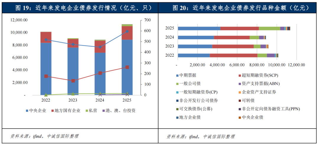 2024~2025年,发电企业债券发行规模稳步增长12,发行结构呈现“央地主导、火电基石、新能源提速”的鲜明特征,融资工具搭配更趋合理。从企业性质来看,中央企业始终是融资核心主体,2025年发行规模达8,889.86亿元、发行数量596只,较2024年的6,814.05亿元、449只大幅回升;地方国企同步增长,2025年发行规模2,174.82亿元、262只,较2024年的1,925.74亿元、207只稳步提升;私营及港澳台企业发行规模从139.32亿元增至285.88亿元,但占比仍不足3%。这一格局源于电力行业的公益性属性及能源基建投资的资金密集特性,央国企凭借更强的信用背书与政策支持,成为融资主力。