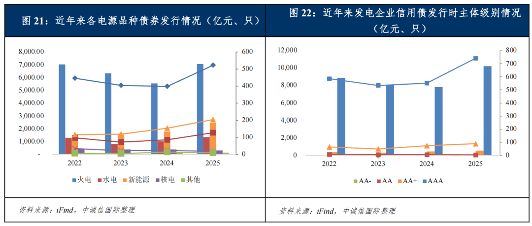 2024~2025年发电企业债券融资规模稳步增长、结构优化,形成了央国企主导、新能源提速的融资格局;行业整体融资成本下行,集中到期压力可控,预计2026年行业融资环境有望持续改善。