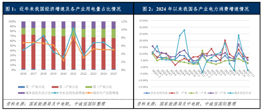 2025年以来,我国经济在复杂的外部环境下实现稳健增长,全社会用电量同比保持中速增长;预计2026年国内高技术及新质生产力的发展仍将对用电增量需求提供支撑,加之经济提质增效政策的持续发力以及极端天气等因素,我国全社会用电需求或将继续保持中速增长态势