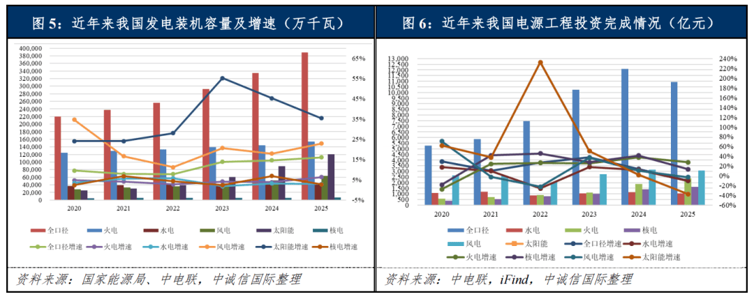 从电源投资规模及结构来看,根据国家能源局发布的全国电力工业统计数据,2025年全国主要发电企业电源工程完成投资10,928亿元,受上年高基数影响同比下降9.57%。近年来在“双碳目标”等政策推动下,我国电源建设重心逐步向新能源和调节型电源转移,近五年全国电源完成投资中清洁能源发电投资比重均在78%以上。但受近年来水不稳定、极端天气增多、新能源爆发式增长带来的调节性需求增加等影响,火电的支撑性、调节性电源地位有所凸显,2022年下半年国家发改委明确提出煤电“三个8,000万”3目标,叠加火电项目加速向高效、低碳、智慧化转型,综合带动2024年及2025年火电投资增速分别达到38.00%和27.73%,火电投资阶段性加速。我国核电项目经过审批提速后进入常态化审批,带动核电投资规模相应增长,2024年及2025年,核电投资增速分别达到41.60%及13.46%。传统水电投资受资源限制以及此前“大水电”建成投运影响有所放缓,但抽水蓄能电站的持续审批4带动2024年水电投资额同比增长12.20%,但2025年受基数影响,水电投资额同比下降10.25%。同时,随着国内第一批风光大基地项目的基本建成投产及第二批、第三批风光大基地建成投产约5,000万千瓦,2024年以来我国风电和太阳能发电投资额增速有所放缓,其中2024年风电及太阳能发电投资额分别同比增长10.90%及1.90%,并受高基数影响分别于2025年同比下降2.61%及37.35%,但仍保持较高投资规模。此外,2025年我国电网工程投资额达6,395.02亿元,同比增长5.11%,“十四五”期间累计完成投资约2.9万亿元。作为“十四五”的收官之年,2025年青藏联网二期扩建工程及金上-湖北±800千伏特高压直流工程等重大电网工程完成投运,同时我国共有蒙西至京津冀±800千伏特高压直流、藏东南至粤港澳大湾区±800 千伏特高压直流等5条特高压工程获批。“十五五”期间,为实现新型电力系统建设,国家电网预计完成固定资产投资4万亿元,较“十四五”期间增长40%左右。同时,南方电网计划于2026年完成固定资产投资1,800亿元。电网建设的不断推进有助于解决风光电等新能源“发得出、送不走、用不好”的难题,进而打通能源生产、输送、消费全链条的堵点难点,为2026年及“十五五”期间电力供应和消纳提供有力支撑。